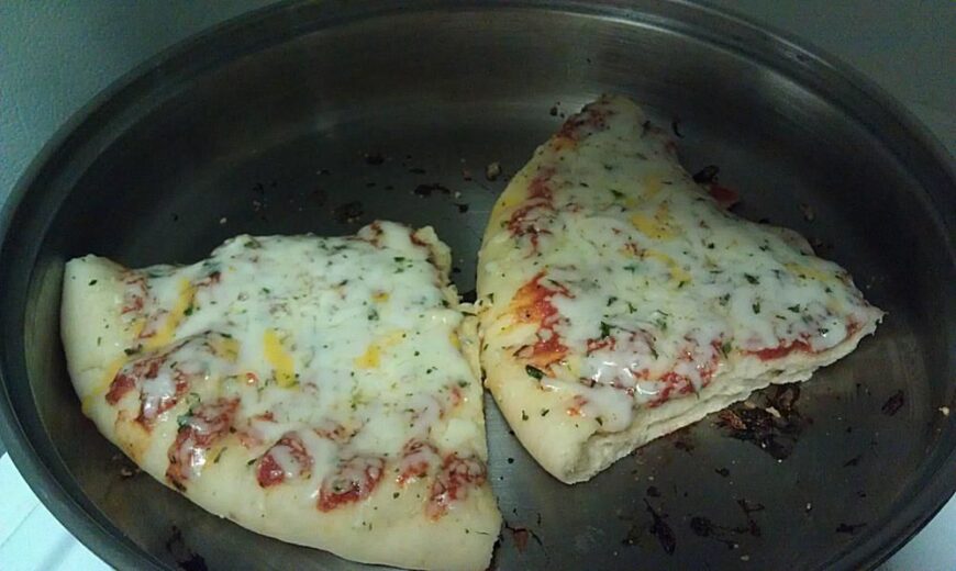 Buying pizzas wrapped in cellophane is ideal for this since you don’t have to worry about losing toppings. All you have to do is flip the pizza over so the topping side is facing down.