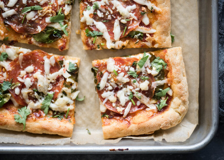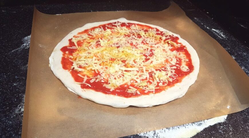 This step applies to anyone using a baking sheet or pizza stone when cooking. It’s always best to use cookware when working with pizza, making the meal easier to serve. Also, you won’t have to worry about grease and toppings collecting and burning at the bottom of your oven.