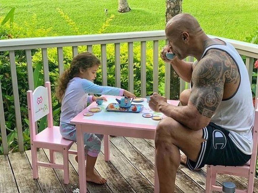 Dwayne Johnson has recently shared a sweet photo with his 3½-year-old daughter, Jasmine Lia. The 47-year-old actor enjoys some tea time with his little daughter in the post. The tea party took place on Sunday morning but the Rock joked that it was ‘5 o’clock somewhere.’