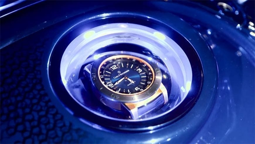The entire bike has a total of 360 diamonds, plus several gold-plated details, like bolt heads and various other parts. The camshaft is visible in its see-through housing and the entire engine section is illuminated from the inside, creating a striking effect. There are two safes built-in on the bike. The one near the fuel tanks contains a Bucherer custom watch, based on the PatraviTravelTec II model. The other has a six-prong Heaven solitaire ring with a 5.40-carat diamond. Both items are gifts to the future owner by Bucherer.