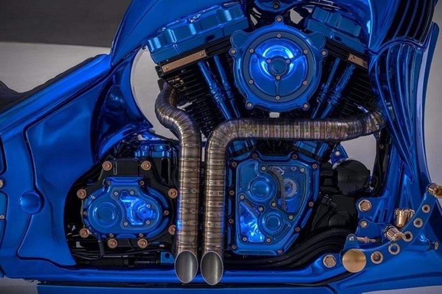 Bucherer’sDizzler rotating ring is mounted on the handlebars, and another pair of them can be found on the forks. Rims are custom made and the engine, a 1.8-litre, Air-Cooled V-Twin with 148NM of torque, has received few tweaks as well. The transmission is manual 6-gearbox. The bike comes with heat-resistant LED lights, and even the throttle valves are gold-plated. All in all, the Blue Edition is more imagined as an expensive piece of jewelry to be admired than a bike for everyday use.
