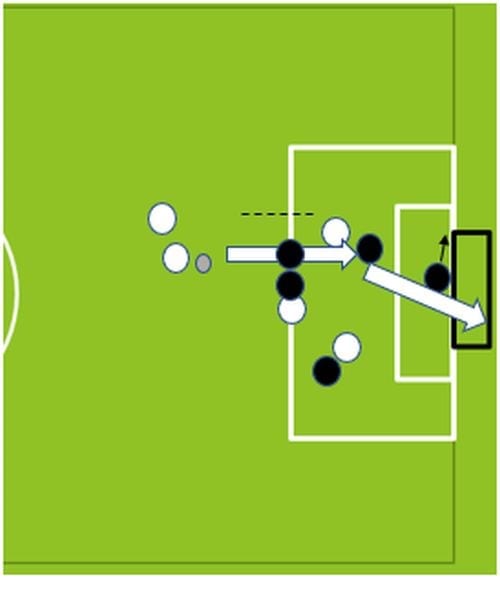 Attackers run across the penalty area. This means that the goalkeeper cannot react until late. If he or she attempts to dive too soon, then any contact from the attackers can result in a goal. If there is no contact, then by the time the keeper commits to saving the ball, it is often too late.