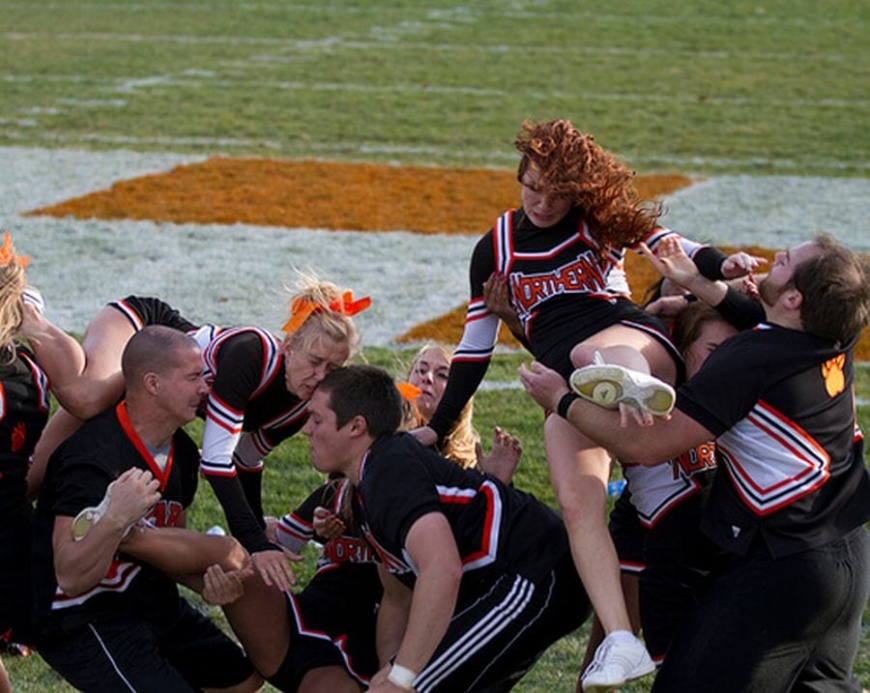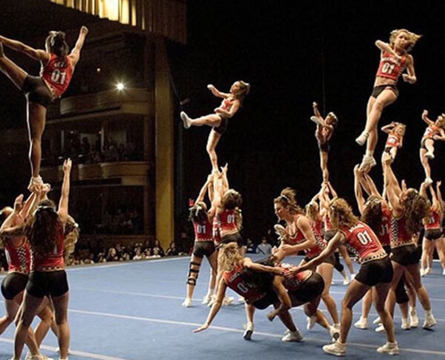 This is a huge group of falling cheerleaders who can’t be in a more uncomfortable position than this one. It’s painful to watch!