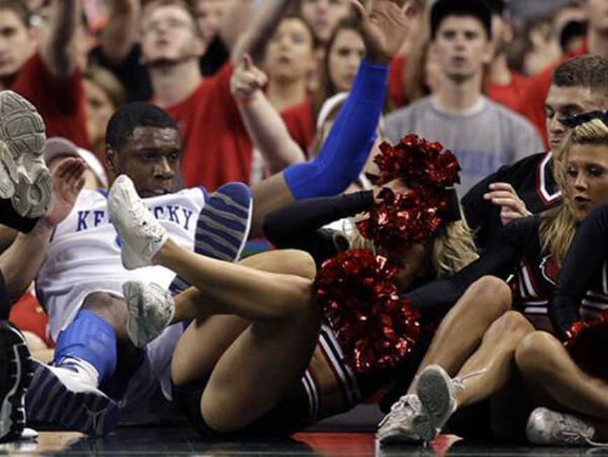 The Kentucky basketball player’s face is priceless. He might be in control of the situation, but the cheerleader was lucky to have those pom-poms for self-defense.