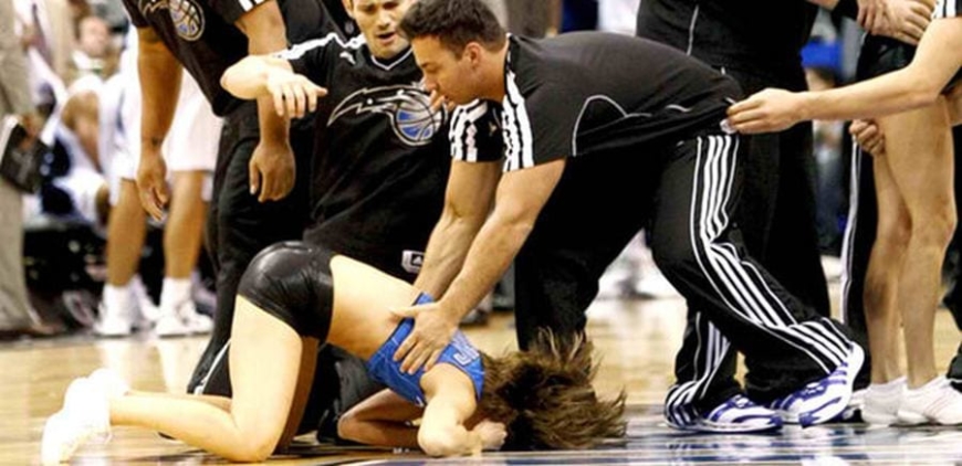 This image is part of a movie Semi-Pro with Will Ferrell who was supposed to nail a cheerleader with a basketball. Besides the fact that it is staged, it is a hilarious and very embarrassing moment for that cheerleader.