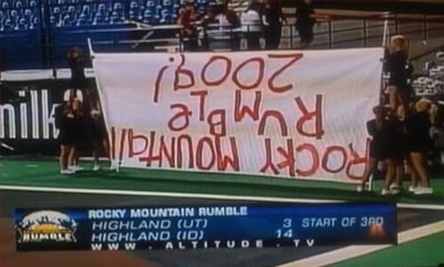 It’s weird how none of the cheerleaders saw that the sign was upside-down, but at least they got the spelling correct.