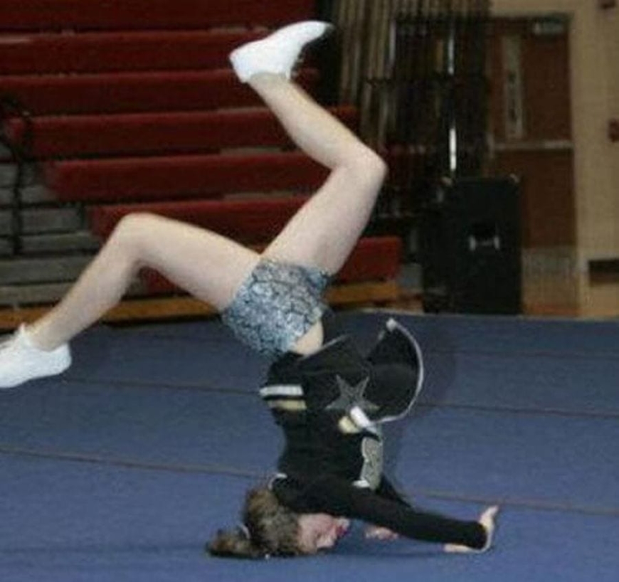 If you know what a scorpion pose in yoga looks like, this cheerleader will remind you of it. Well, it’s a bit of a modified scorpion pose, but who cares!