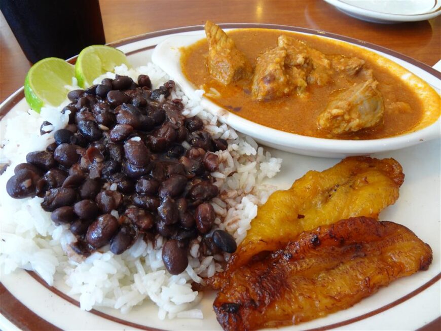 African, Caribbean, and Spanish cultures influence Cuban cuisine. The most common side dish is Cristianos y Moros, which is white rice with dark beans. There are many chicken and pork dishes on the menu. The cook usually cuts the beef into thin slices and chunks. Bananas fried in oil are no less satisfying, often served with various dishes as a side dish. Fresh fish is done only in tourist hotels.