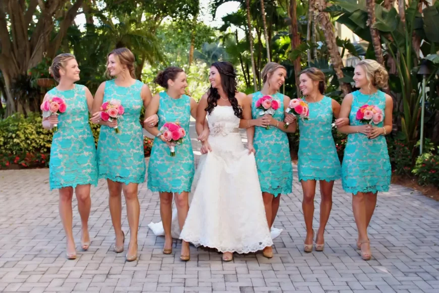 The turquoise color dresses can be great if you are having a wedding in some open area like a garden or near some lake. The point is to create a plan in advance and check different solutions. You will have to find a store where all of your bridesmaids can have the same dress, and that can be challenging if they need different sizes as well.